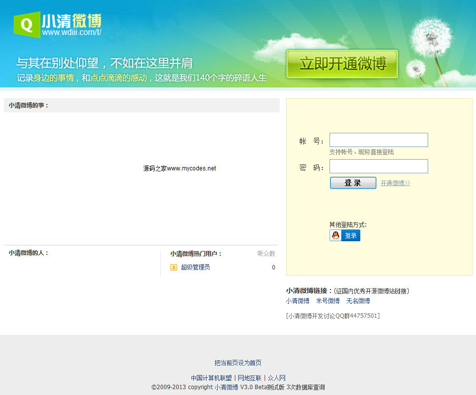 asp小清微博3.1源码,高仿腾讯微博系统,小清微博是一套集成多用户微博、网址收藏功能的开源程序,程序全部由小清开发,无加密无版权,可以自由使用。